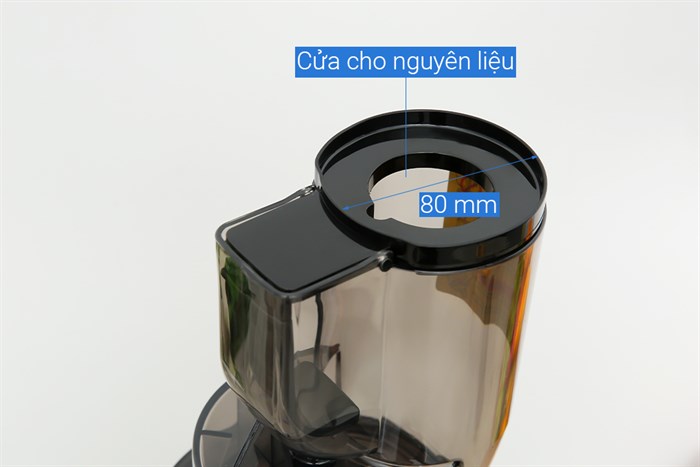 Máy ép chậm Sunhouse SHD5503 thiết kế ống tiếp nguyên liệu có đường kính cửa nhỏ 44 mm hỗ trợ ép trái cây cỡ nhỏ như dâu tây nguyên trái, đường kính cửa lớn 80 mm cho khả năng ép được nguyên quả táo, lê nhỏ, ép các trái cây rau củ miếng lớn dễ dàng.
