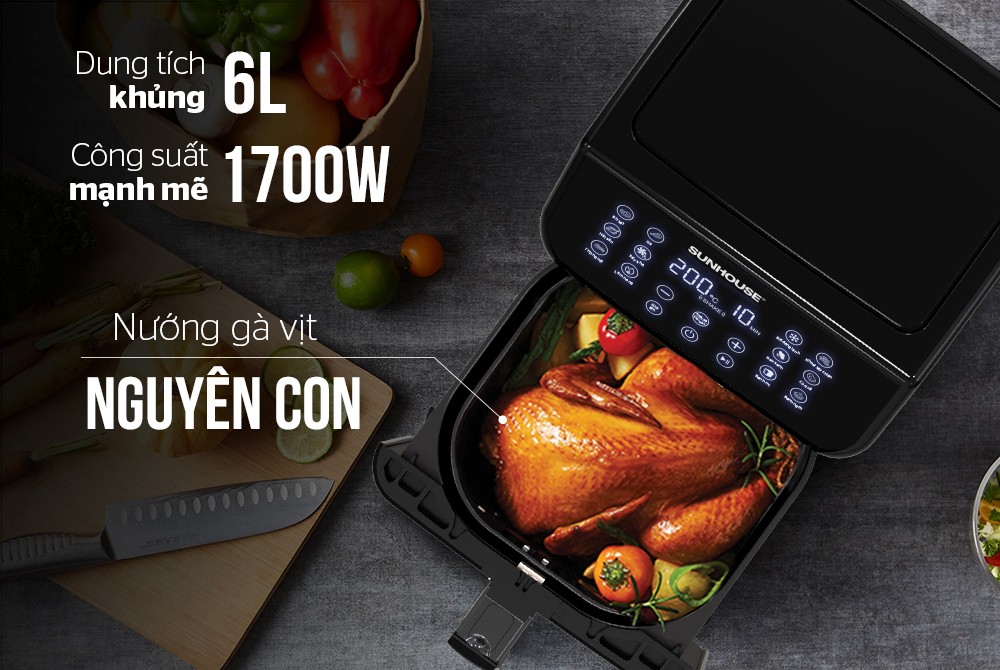 Nồi chiên không dầu Sunhouse SHD4087 có kiểu dáng hiện đại với tone màu đen, bạc tối giản mà sang trọng, phù hợp với nhiều không gian nội thất khác nhau. Dung tích lớn đến 6 lít có thể nướng gà vịt nguyên con, chế biến các món ăn cầu kì. Mặt trước nồi cấu tạo từ chất liệu inox cao cấp, chống trầy xước, dễ lau chùi, vệ sinh.