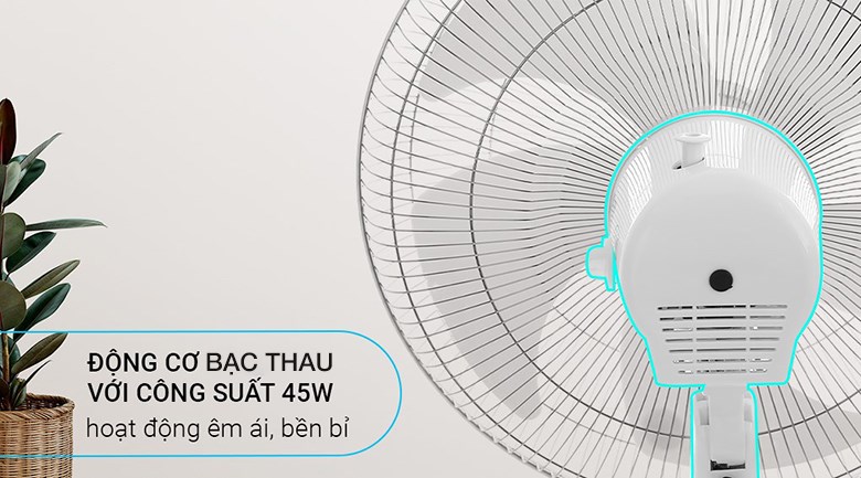 Quạt thuộc dòng quạt điện cơ có công suất hoạt động 45W, quạt có đường kính 40 cm, sải cánh rộng tạo lưu lượng gió mạnh làm mát hiệu quả cho diện tích phòng rộng