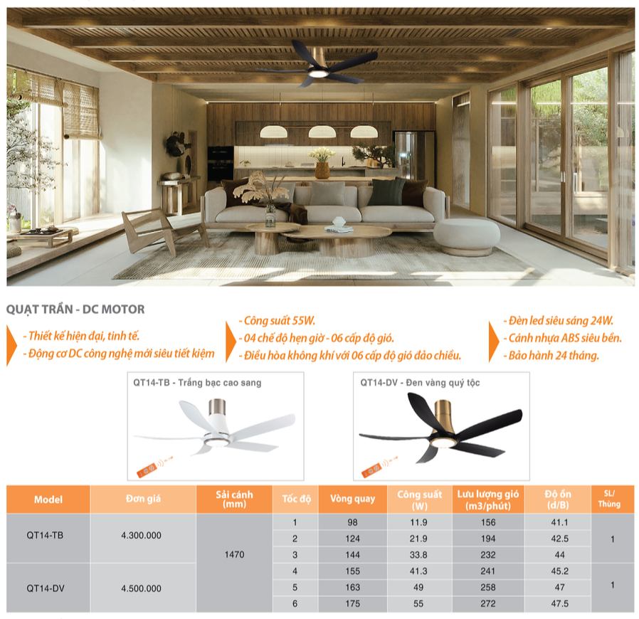- Công suất động cơ 55W kết hợp sải cánh 1470mm siêu gió mát.